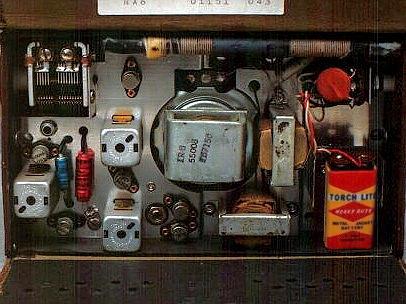 These three construction practices are holdovers from the tube radio era. While this radio was being built, other transistor manufactures were using miniature coils, thin printed circuits, and soldered-in transistors. You can see three transistors and their sockets just below the bottom left corner of the big square speaker magnet holder in the middle. Look for three shiny round objects forming points of a triangle just below the "IR 6" printing on the speaker magnet holder. |