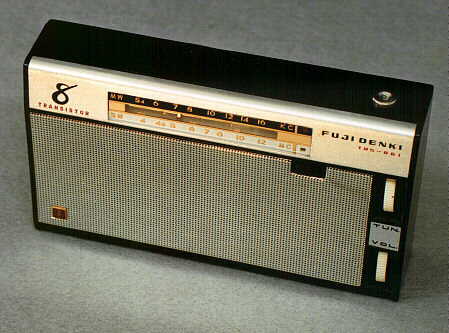 The leather case smells brand new, and it comes with a screw in antenna (note the jack at top right). The clean lines of this radio represents a departure from the campy 50s look just a few years earlier. The tuning dial, AM and SW (shortwave), is beautifully reverse painted.  |