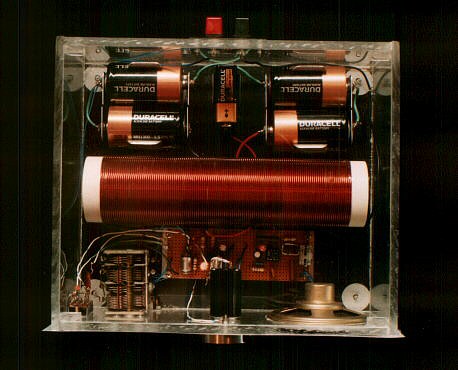 9 volt battery runs the radio, D cells run the amplifier. The reason it gets such good reception with only one transistor is that after amplifying a distant, weak signal, it feeds that amplified signal back into the antenna input section, amplifying it again, and again, and again, ad infinitum. |