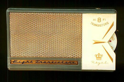 Reverse painting is a technique of applying paint on the backside of a clear coat of plastic for protection and 3-D beauty. Sometimes the sheen is reminescent of stained glass windows.. Notice the "V" shaped arrows and pointers, common in the late 50s-early 60s. Find more "V" examples here and here. Also common were regal names: Royal, Regency, Viscount, Coronet, King, and Crown. To see a stunning bright red variant of this radio, click HERE.  |