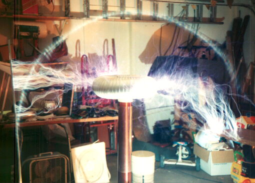 The power sparks you see are over two feet long striking wood, not metal. I have since been able to achieve arcs over four feet long, at hundreds of thousands of volts! |
