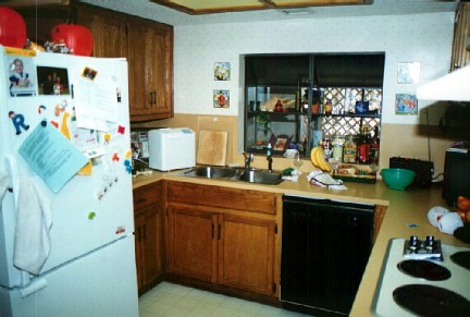 Refrigerator magnets, breadmaker, cutting board, dishes, windowbox clutter | De-cluttered, clean & shiny now, dynamized by colorful fresh fruit |