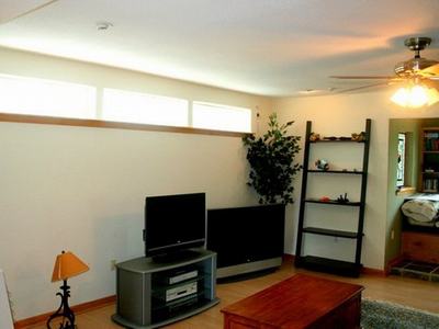 Ample storage under window seat Pretty view of shady , private front yard This room is BIG , for easy furniture placement