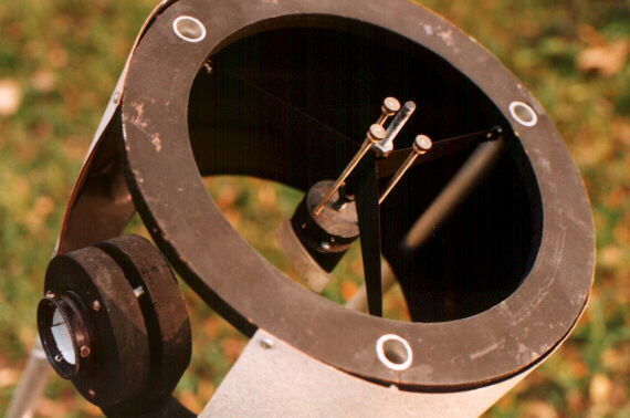 ![]() The eyepiece focuser is on the left. It has to be adjusted during reassembly, so it's mounted in two small plywood rings held together by three adjusting screws and springs. In the middle of the photo you can see the small diagonal mirror (appears white) mounted on the diagonal holder with three long brass adjusting screws attached. I cast the diagonal holder out of automotive Bondo. I've never seen a design using long screws before, as most use regular short flathead screws. When you adjust these things, you have to be looking through the eyepiece, not at the screws and the screwdriver, so I came up with this better way. It also eliminates the disastrous possiblity of dropping the screwdriver down onto the primary mirror! The shroud was an afterthought, made necessary by streetlights. You can tell this scope gets used because the top was once flat black all over! |
