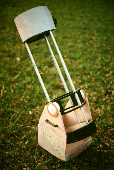 My telescope was designed to break down and fit into a suitcase. It uses the 8" primary mirror at the bottom to collect lots of faint light and concentrate it onto a small mirror in the gray shroud. The small mirror is mounted at an angle to beam the light out the side of the shroud, and into a magnifying eyepiece.